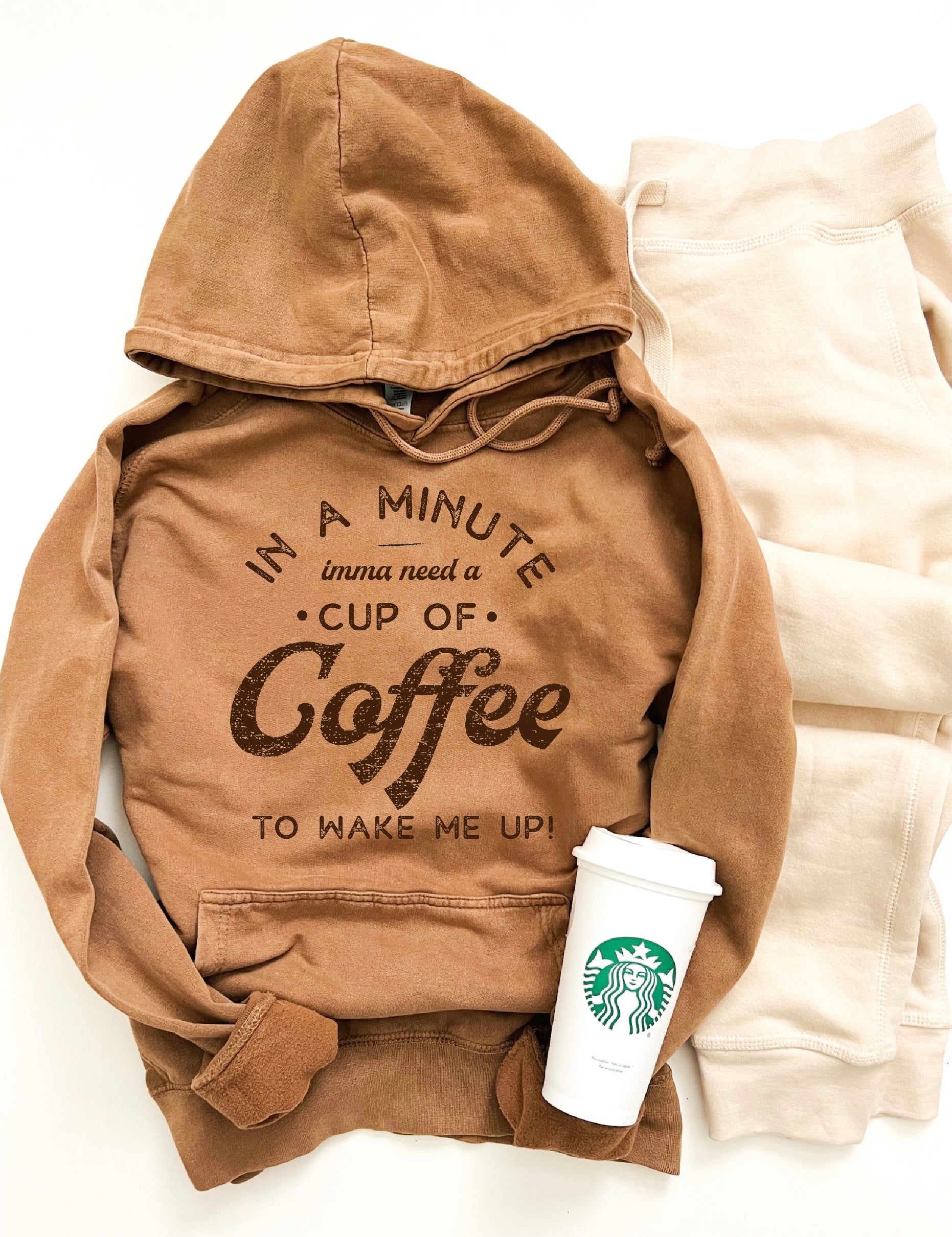 In a minute imma need a cup of coffee vintage wash hoodie. We have the joggers too!